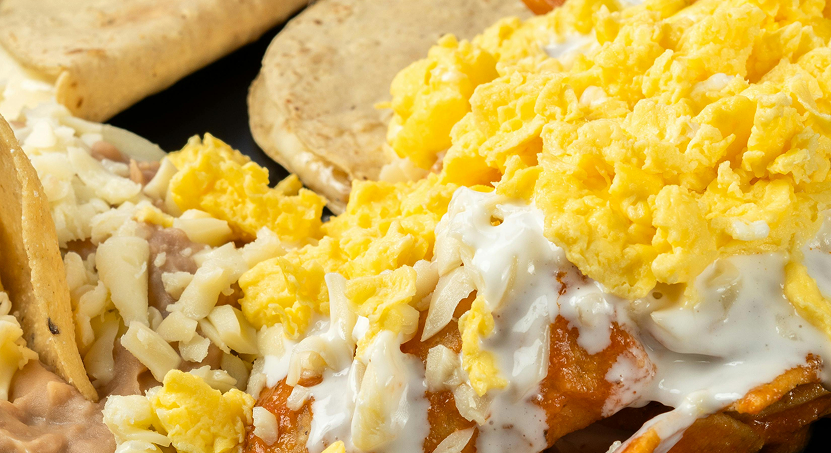 Tortilla strips scrambled with two eggs, chorizo, tomatoes, diced jalapeños, Oaxaca cheese topped with cilantro and cotija cheese. Served with black beans, Yucatan potatoes and two flour tortillas.