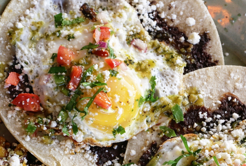 Two corn tortillas topped with black beans, fried eggs, tomatillo salsa, queso fresco and served with Yucatan potatoes and plantains.