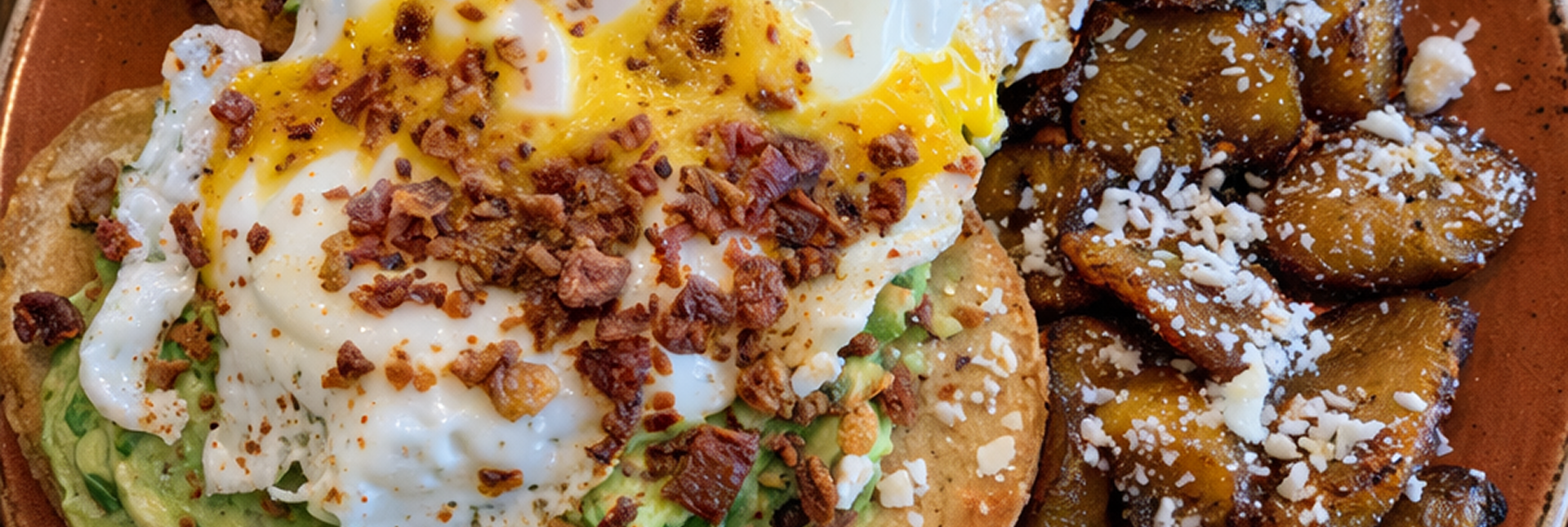 Toasted bolillo bread topped with guacamole, two fried eggs and bacon-tajin confetti. Served with plantains.
