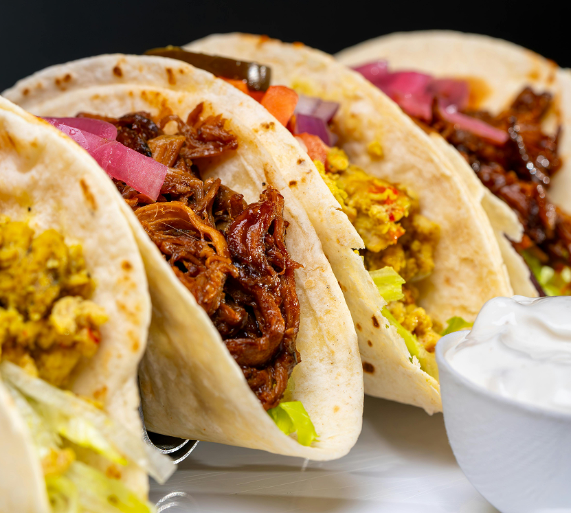 Your choice of any two breakfast tacos served with Yucatan potatoes and black beans. Vegan option served with Tajin potatoes.