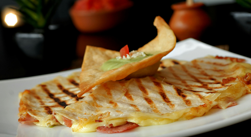Three crispy corn tortillas stuffed with black beans, cheese, carnitas and topped with two fried eggs, avocado crema. Served with Yucatan potatoes and plantains.